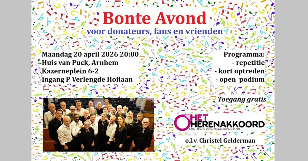 Het Herenakkoord is het homomannenkoor uit Arnhem en omgeving. Op dit moment telt het koor 25 leden uit de hele regio. Wij repeteren op maandagavond in Huis van Puck in Arnhem onder de bezielende leiding van dirigent Christel Gelderman. We vinden het heel belangrijk om regelmatig op te treden. Hoogtepunten waren de optredens in binnen- en buitenland tijdens grote en kleinere festivals. Maar ook dichterbij huis treden wij graag op. Bekijk onze agenda voor aanstaande concerten. Het repertoire van Het Herenakkoord is heel gevarieerd: van een Spaans volksliedje tot een Eurovisie Songfestival-hit. Meer informatie of lid worden? Neem dan even contact op. Of lees hier meer over ons koor en zijn geschiedenis. Het koor kent ook al vele jaren donateurs. Lees hier hoe je donateur kunt worden.